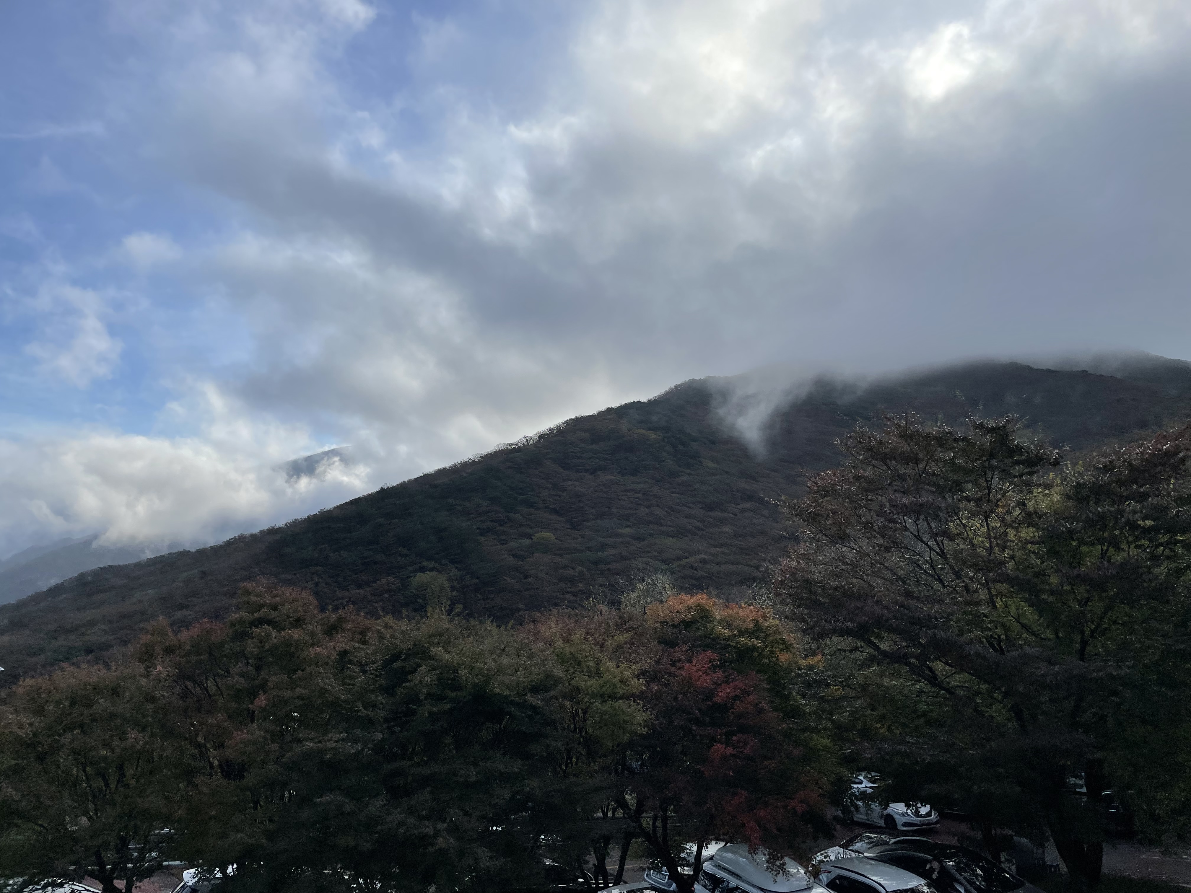 보이시나요 맑은 아랫동네 날씨와 정상 쪽의 안개무리가ㅎ